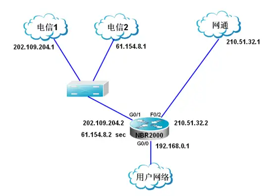 说明:用户使用NBR2000作为网吧出口路由器,接入线路共3条,两条电信线路,一条网通线路。由于NBR2000只有2个WAN口,因此两条电信线路通过一台二层交换机连接到NBR2000的WAN 0口上,WAN 0口配置两个IP地址(其中一个为second ip),WAN 1口连接网通线路。IP地址如图所示。