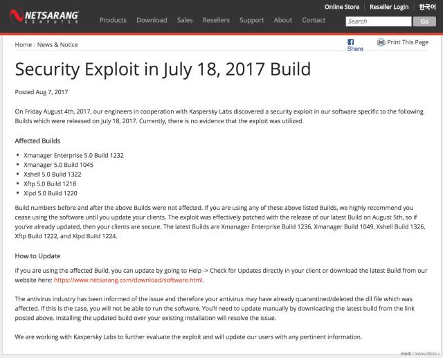 Xshell开发公司NetSarang发布公告称,2017年8月4日与卡巴斯基工程师发现Xshell软件中存在后门。黑客似乎入侵了相关开发人员的电脑,在源码植入后门,导致官方版本也受到影响。并且由于dll文件已有官方签名,众多杀毒软件依据白名单机制没有报毒。