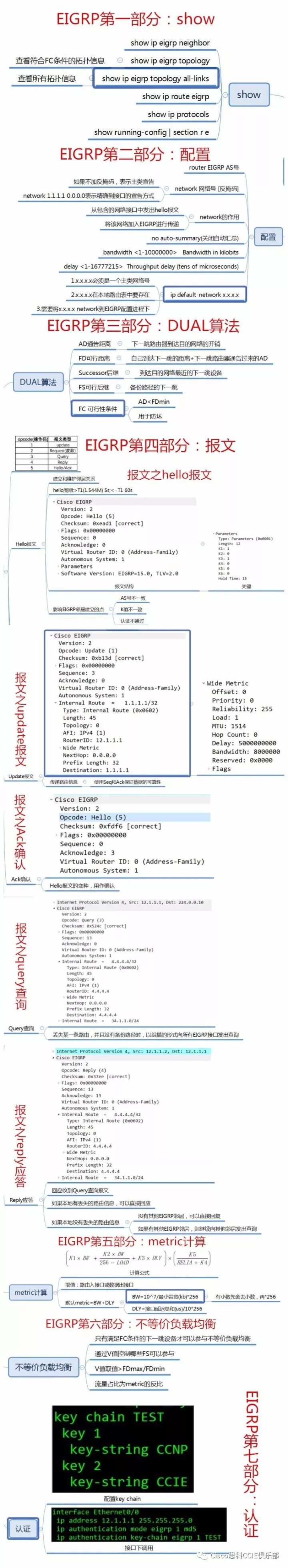 CCNP EIGRP主要分为show、配置、dual算法、报文、metric计算、不等价负载均衡以及认证几部分组成。