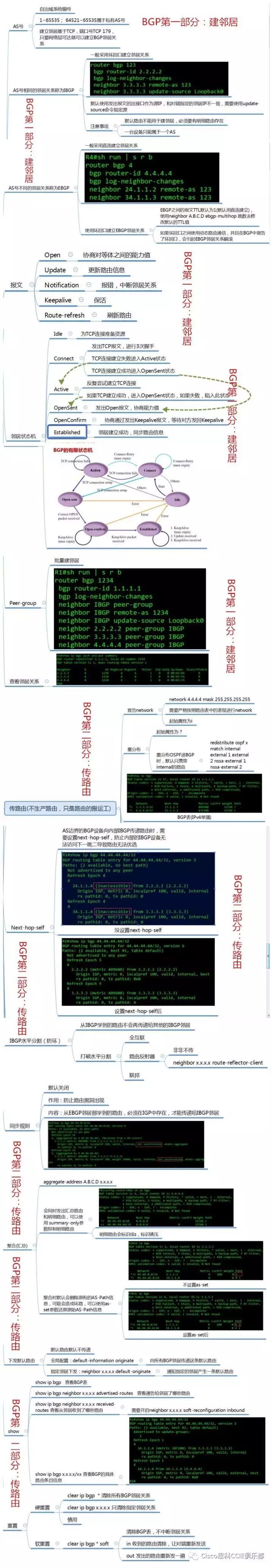 传路由包括宣告network、重分布、BGP表、next-hop-self、IBGP水平分割、同步规则、聚合汇总、下发默认路由、show、重置。
