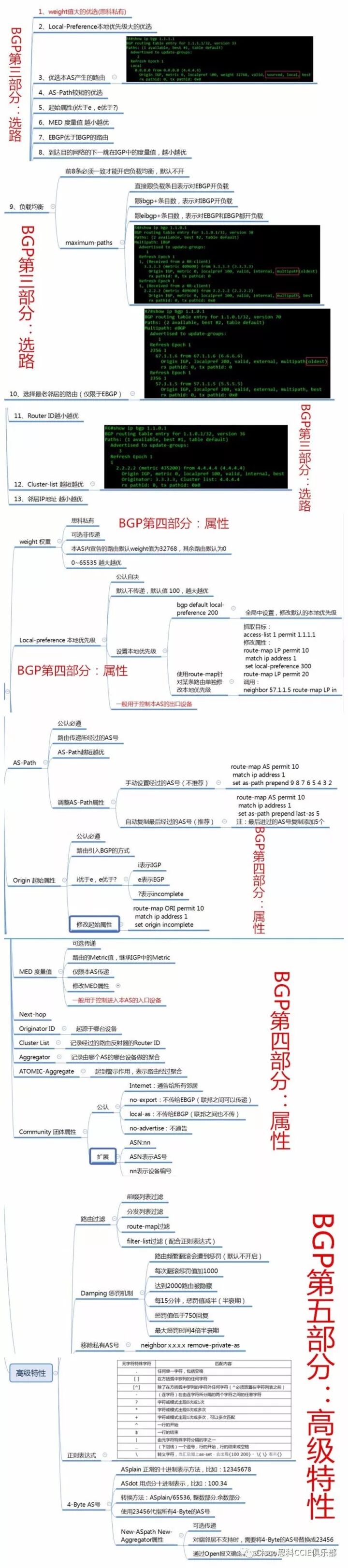 高级特性包括路由过滤、damping惩罚机制、移除私有AS号、正则表达式、4-Byte AS号。