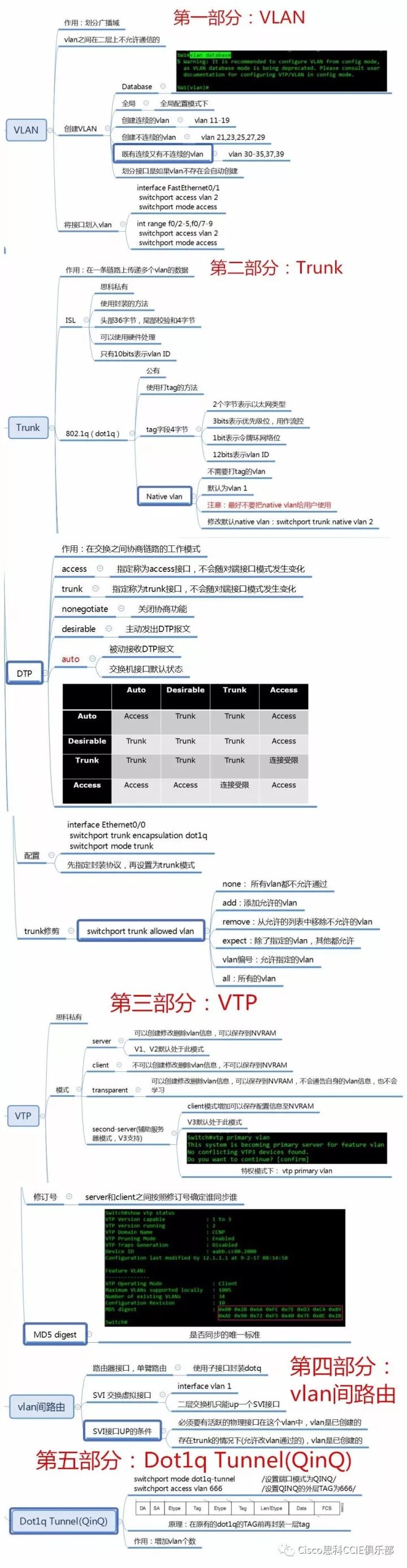 Trunk主要包括作用:在一条链路上传递多个vlan的数据、ISL、802.1q(dot1q)、DTP、配置、trunk修剪;